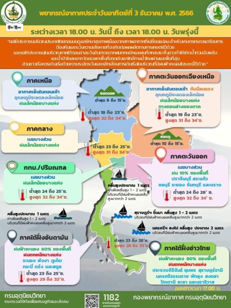 วันที่ 3 ธันวาคม 2566 กรมอุตุนิยมวิทยา พยากรณ์อากาศ 24 ชั่วโมงข้างหน้า บริเวณความกดอากาศสูงหรือมวลอากาศเย็นกำลังปานกลางจากประเทศจีนปกคลุมภาคตะวันออกเฉียงเหนือและทะเลจีนใต้ ส่งผลให้ลมตะวันออกพัดพาความชื้นจากทะเลจีนใต้และอ่าวไทยเข้ามาปกคลุมประเทศไทยตอนบน ลักษณะดังกล่าวส่งผลให้ประเทศไทยตอนบนมีฝนตกหนักบางพื้นที่ภาคเหนือและภาคตะวันออกเฉียงเหนือ อากาศเย็นสบายในตอนเช้า ขอให้ประชาชนในประเทศไทยตอนบนดูแลสุขภาพเนื่องจากสภาพอากาศที่เปลี่ยนแปลง สำหรับเกษตรกรควรเตรียมการป้องกันและระวังความเสียหายที่อาจเกิดขึ้นกับสินค้าเกษตรส่วนมรสุมตะวันออกเฉียงเหนือที่พัดปกคลุมอ่าวไทยและภาคใต้มีกำลังปานกลาง ลักษณะดังกล่าวทำให้ภาคใต้ตอนล่างมีฝนตกหนักบางแห่ง คลื่นลมบริเวณอ่าวไทยตอนล่างมีกำลังปานกลาง จะมีคลื่นสูงประมาณ 2 เมตร บริเวณที่มีพายุฝนฟ้าคะนองคลื่นสูงมากกว่า 2 เมตร บริเวณอ่าวไทยตอนบนจะมีคลื่นสูง 1-2 เมตร บริเวณที่มีพายุฝนฟ้าคะนองคลื่นสูงมากกว่า 2 เมตร บริเวณทะเลอันดามันจะมีคลื่นสูงประมาณ 1 เมตร ห่างจากฝั่งออกไป สูง 1-2 เมตร บริเวณที่มีพายุฝนฟ้าคะนองคลื่นสูงเกิน 2 เมตรขอให้ประชาชนภาคใต้ตอนล่างระวังอันตรายจากฝนตกหนักและฝนสะสม ซึ่งอาจก่อให้เกิดน้ำท่วมฉับพลันและน้ำท่วมฉับพลันได้ โดยเฉพาะบริเวณเนินเขา ใกล้ทางน้ำ และพื้นที่ราบลุ่ม ชาวเรือควรเดินเรือด้วยความระมัดระวังและหลีกเลี่ยงการเดินเรือในบริเวณที่มีพายุฝนฟ้าคะนองในช่วงนี้พยากรณ์อากาศสำหรับประเทศไทย เวลา 18.00 น. วันนี้ถึง 18.00 น. พรุ่งนี้.