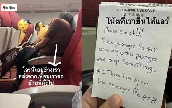 นาทีระทึกสาวแปลงร่างเป็นนาตาชา จับโจรนั่งใกล้ ๆ แอบขโมยของก่อนรีบไปส่งสัญญาณให้แอร์โฮสเตส โทรแจ้งตำรวจจับบนเครื่องบินกลายเป็นเรื่องตักเตือน.. ที่ได้รับความสนใจ สำหรับผู้ที่ต้องเดินทางในเส้นทางระหว่างประเทศ หลังจากที่ผู้ใช้เฟซบุ๊ก “กัญญา ชุมสนะ” ออกมาแชร์ประสบการณ์เที่ยวฮ่องกงเมื่อเวลา 03.00 น. วันที่ 27 พ.ย. ในกลุ่ม “เที่ยวยุโรปด้วยตัวเอง”เธอสังเกตเห็นขโมย เขาแอบจ้องมองโจรที่นั่งอยู่ใกล้ๆ ก่อนที่จะเขียนข้อความเพื่อส่งสัญญาณไปยังแอร์โฮสเตสบนเครื่องบิน จนนำไปสู่การจับกุมผู้กระทำความผิดในที่สุด กล่าวเสริมว่า